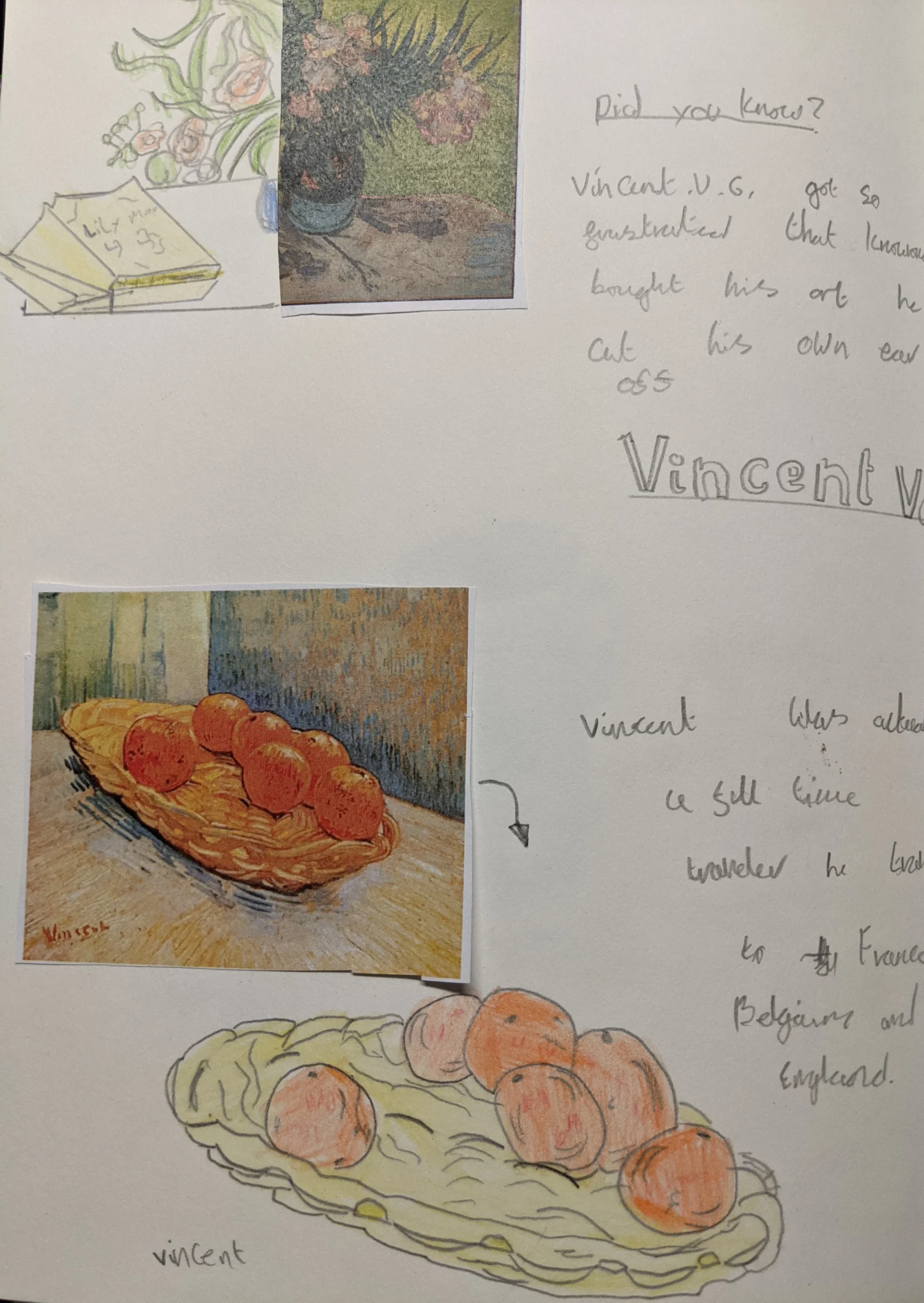 Throughout KS2, children build upon their early art skills with increasing sophistication, accuracy and independence. They develop confidence in drawing from observation, using geometry, proportion, perspective and tonal shading to create more realistic and expressive work. Pupils explore how artists use line, tone and expression, learning advanced techniques such as chiaroscuro, negative drawing and still life to describe form, light and shadow.