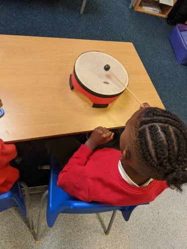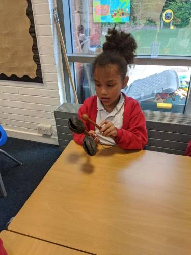 Finally, in Music the children explored a range of percussion instruments. Each child was given an instrument and had the opportunity to learn how to play it correctly and carefully, using appropriate techniques such as tapping, shaking or striking with control.