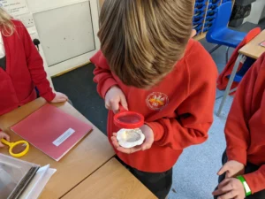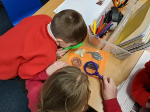 In Science this week, we used magnifying glasses and pocket microscopes to explore fossils. We also learned how fossils are formed and where they can be found.
