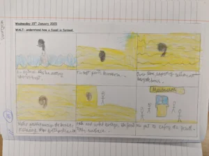 In Science, we continued looking at fossils and how they are formed. To help us remember the process of fossilisation, we created a comic strip which shows the process from start to finish.