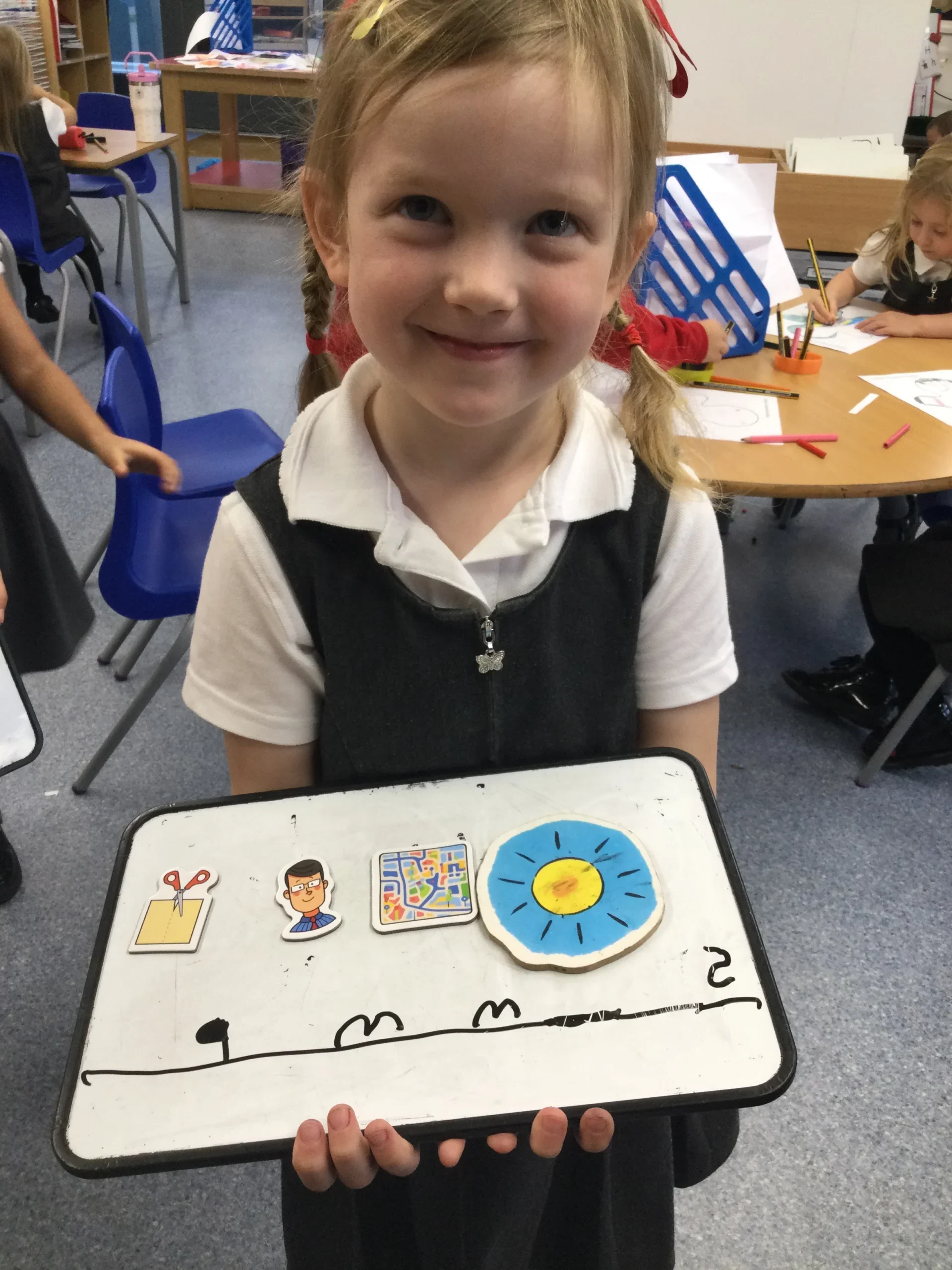 This week, the children took their first exciting steps into the world of phonics! They were introduced to the Phonemes (sounds) ‘s’, ‘a’, ‘t’, and ‘p’, and they had so much fun exploring each one. From spotting everyday objects that start with these sounds to having a go at writing the letters on whiteboards. We are so proud of how engaged and eager they have been during our lessons and we look forward to watching their phonic knowledge grow week on week.